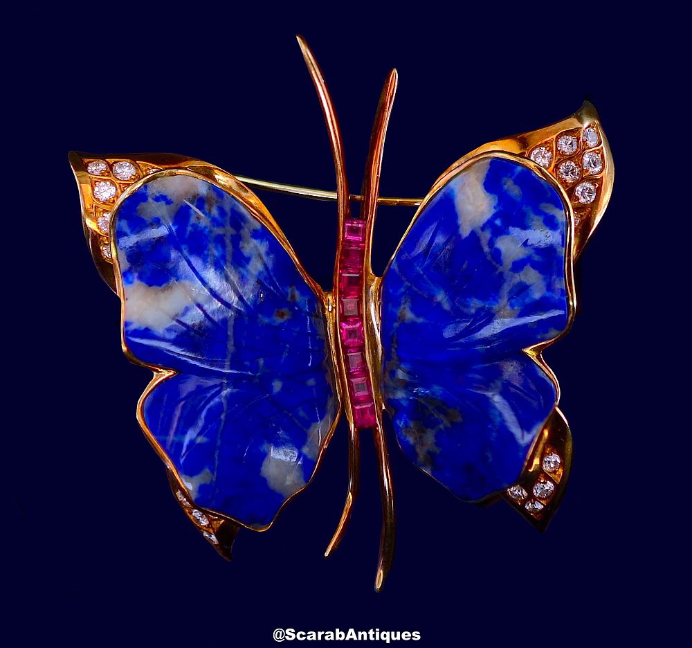 This is a dramatic brooch. Made as a butterfly in 18ct yellow gold it has lapis lazuli wings with diamond tips and a ruby set body.