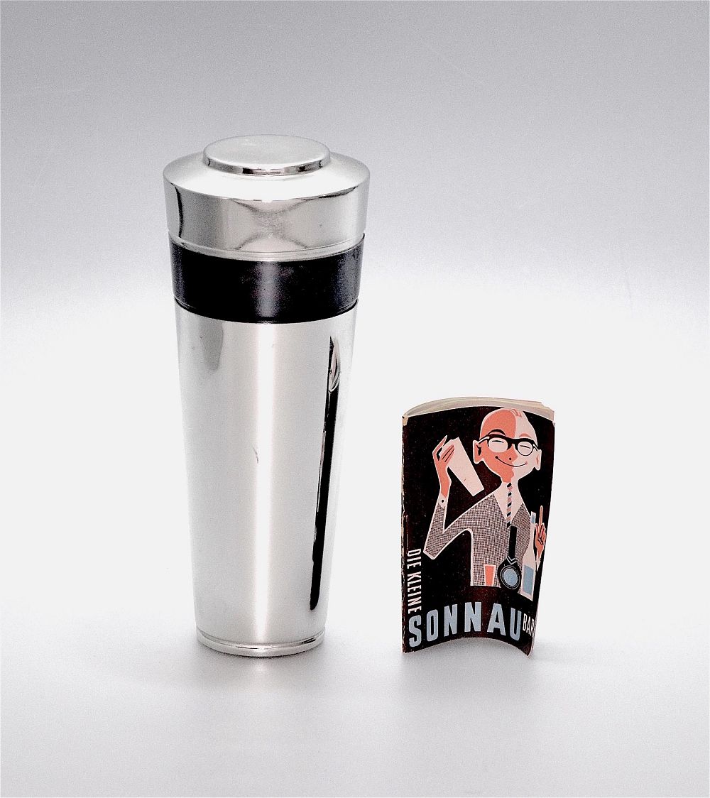 This is a stylish 1960s cocktail shaker. Known as "Die Kleine Sonnau", it is German and in three sections, the second & middle section being the strainer which when turned upside down is a lemon squeezer. This section has been anodised. There is a small illustrated recipe book (in German). The base is is stamped "Sonnau Shaker. Made in Germany"