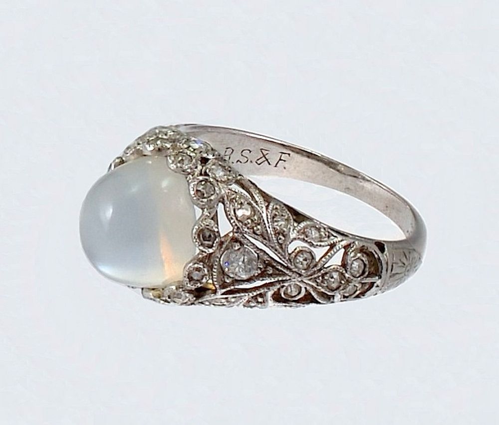 This beautiful platinum Art Deco ring has a slightly domed filigree work top in the centre of which is a fine sugar loaf cabochon moonstone with a fine eye. The filigree work is randomly set with round diamonds some in mille-grained rubover tube settings and some in bead claw settings. There are round diamonds set around the base of the moonstone in mille-grained rub over settings
