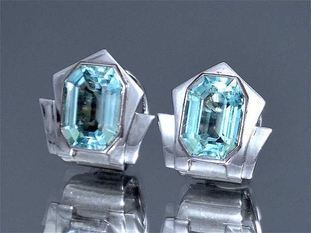 In the centre of each of these elegantly simple 14ct white gold shield shaped clip earrings is a fine emerald cut aquamarine.