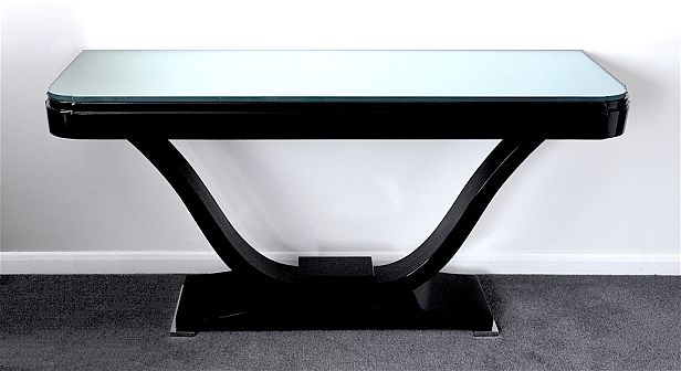 This fabulous Art Deco console table is in black lacquered wood with a mirrored glass top. The oblong pedestal base has chrome bar feet and from the base two curved supports sweep up to the base of the top.