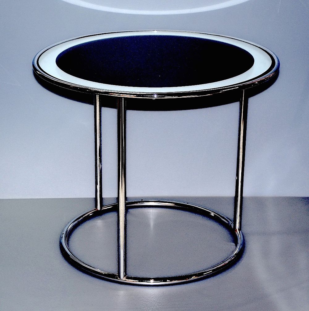 This fabulous circular occasional table is in chrome and has a mirrored glass top. The round tubular chrome base has three tubular chrome legs leading to a chrome round tubular top inset into which is a round mirrored glass top that has a black glass centre and a mirrored glass surround. The original glass top was too foxed and pitted to use and so we have replaced it using the original as a template. Stylish & useful.