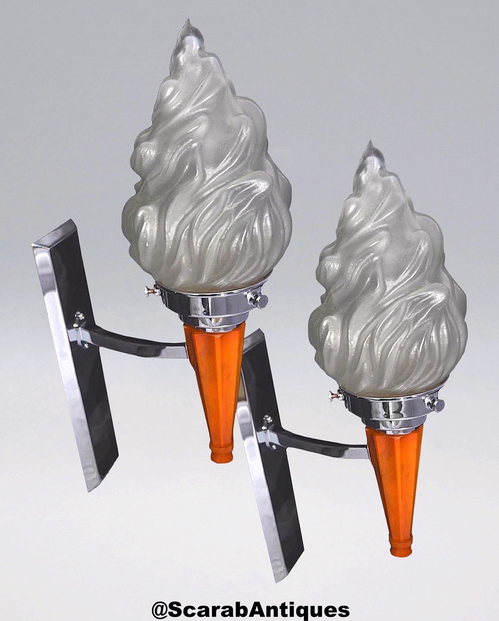 Art Deco pair of chrome & catalin wall lights with flame shades
