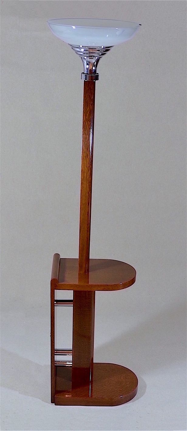 This wonderful table with integral uplighter was made during the 1930s probably in France. The table has a closed back and two shelves, the bottom shelf being the base. The stem for the uplighter runs from the base and there are three chrome tubes between the two shelves running from the back to the stem. At the top of the wooden stem is a tiered chrome cup into which the opaque white glass uplighter shade fits. This is a very neat, well proportioned piece of furniture, not clumpy like many of the uplighter tables. In short, one of the nicest ones that I have seen.