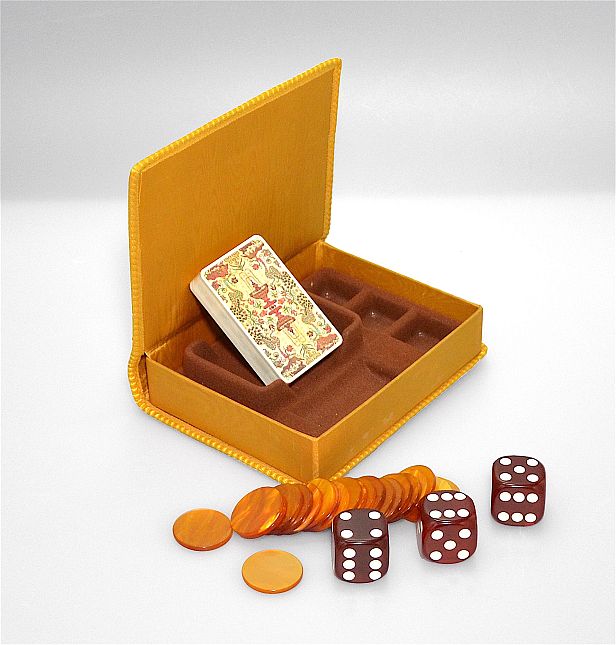 The box is edged and lined with gold taffeta moire and inside in their own compartments are a pack of cards, three amber phenolic die with white spots and 22 amber phenolic counters.