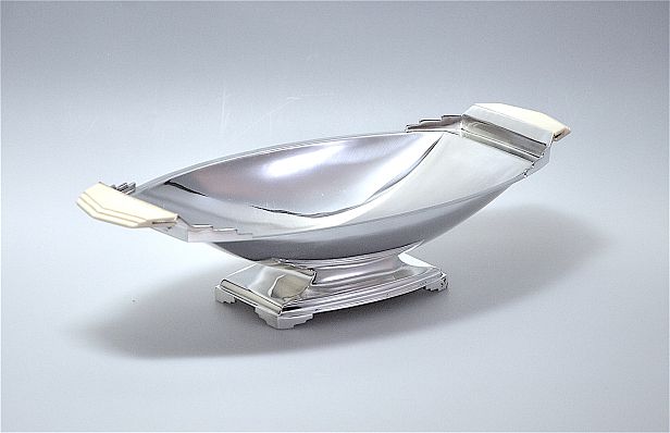 This very elegant silver plated footed bowl was made during the Art Deco period by CW Fletcher & Sons Ltd of Sheffield. The footed tiered rectangular base supports a boat shaped top with tiered ivorine composite handles. The underside is marked " "EPNS A1 Arundel Plate 3837" with the remains of the letters "CWF S" visible above. Would look wonderful with the silver plated and ivorine tazza that is also on the site.