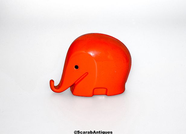 Another orange plastic elephant designed by Luigi Colani for Dresdner Bank in the 1960s. This elephant does not have an opening in the base but the base is embossed "Dresdner Bank".
