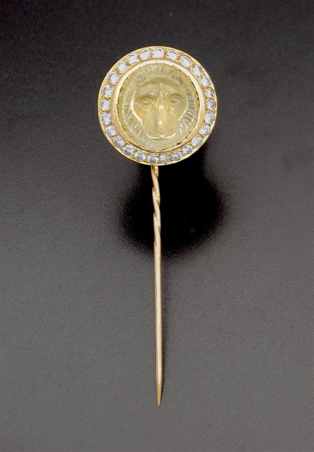 Again another fabulous 18ct yellow gold stick pin this time with a yellow sapphire carved as a lion's head surrounded by a border of 25 round diamonds.