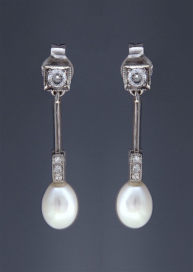 I love the classic combination of pearls & diamonds in these platinum drop earrings. The top of each earring has a round diamond set in claws within a mille-grained box setting. Suspended from each top is a knife edged bar that ends in a rectangular mille-grained box setting in which there are 3 small round diamonds fixed to the bottom of which is a teardrop shaped freshwater cream white pearl. They have posts for pierced ears and 18ct white gold butterflies. The earrings are hallmarked by the London Assay Office for Platinum & 2017 and bear the sponsor's mark "A&SP" fro Alan & Sue Poultney having been made to Alan's design. A super every day wear.