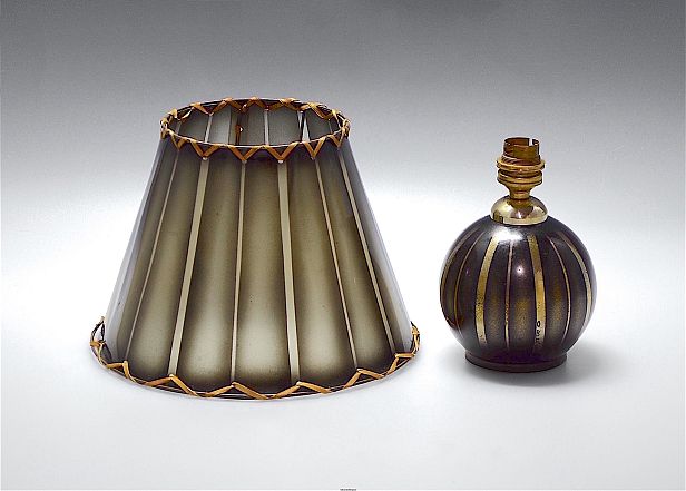 This is a gorgeous small Art Deco dinanderie lamp with its matching composite lampshade. The round base is decorated in alternating vertical stripes of pale gold and black shading to bronze enamel. The composite lampshade is also in stripes of pale gold and black shading to bronze with oversewn top and bottom. It is signed "Obert".
