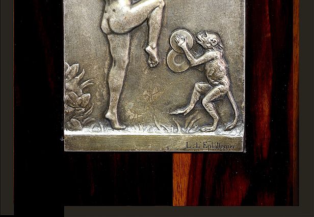 This is another L'Eplattenier silvered bronze plaque but this one depicts a single nude dancing woman with a cymbal looking down towards a dancing monkey also holding cymbals.