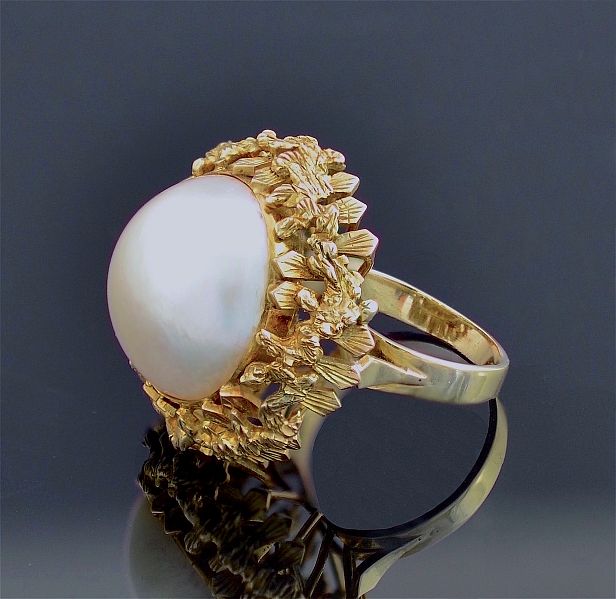 This impressive ring was probably made in the 1970s. In the centre of the ring is a large fine pinkish/white mabe pearl set in a framework of 14ct leaf like sections above a 14ct yellow gold shank.