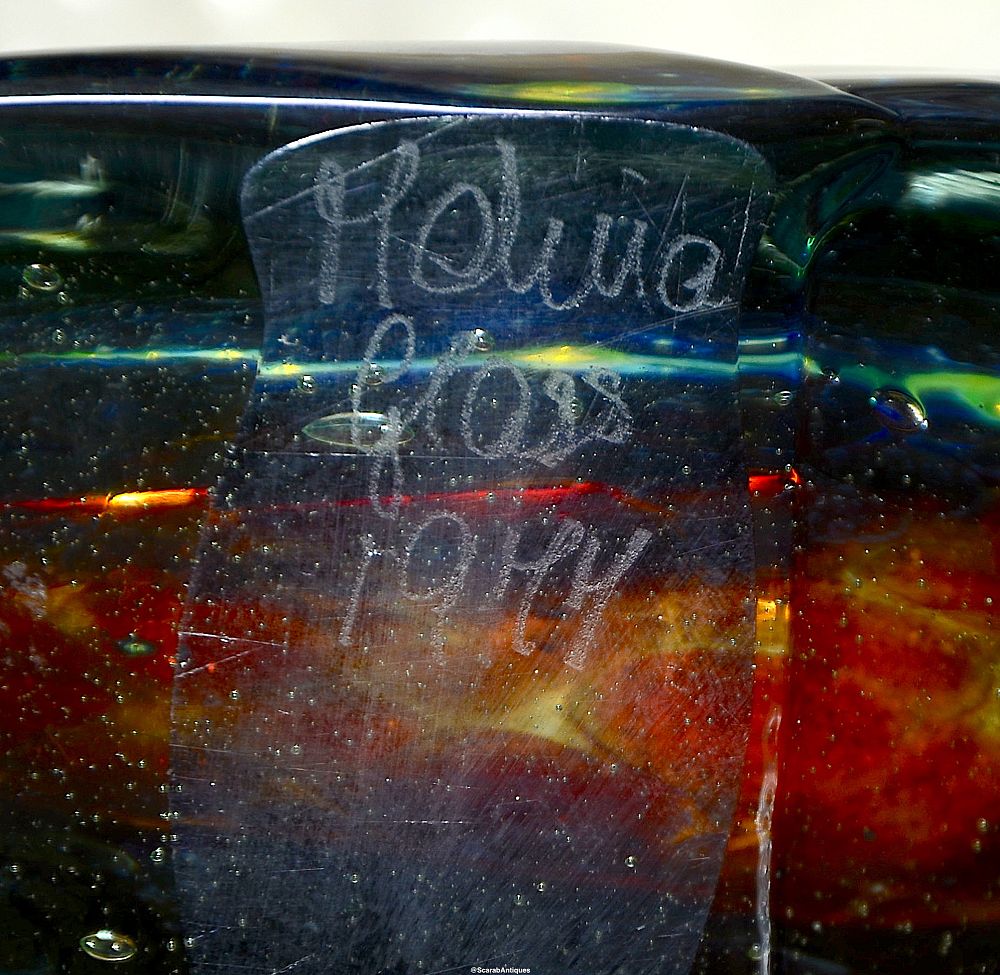 This is one of the iconic Fish vases designed by Michael Harris for Mdina Glass but made in 1977 after he left Mdina Glass. This small vase has an internal mottled brown colour with swirling silver oxide streaks. The clear glass casing has horizontal trails of clear glass and the base is signed "Mdina Glass 1977". Most of the black & white Thomas Tower Mdina Glass label remains. A great piece for your collection.