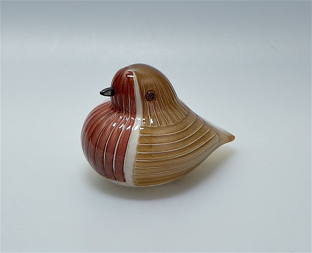 This very cute hollow blown robin was made by Michael Hunter for Twists Glass in 2016. The little fellow is hollow blown and has a brown zanfirico cane body and wings with a red zanfirico cane breast, bordered on each side by white zanfirico cane stripes. It has a black zanfirico cane beak and blue red & yellow murrine cane eyes. The base is scratch signed "M Hunter Twists 16" and has the Twists Glass studio label.
