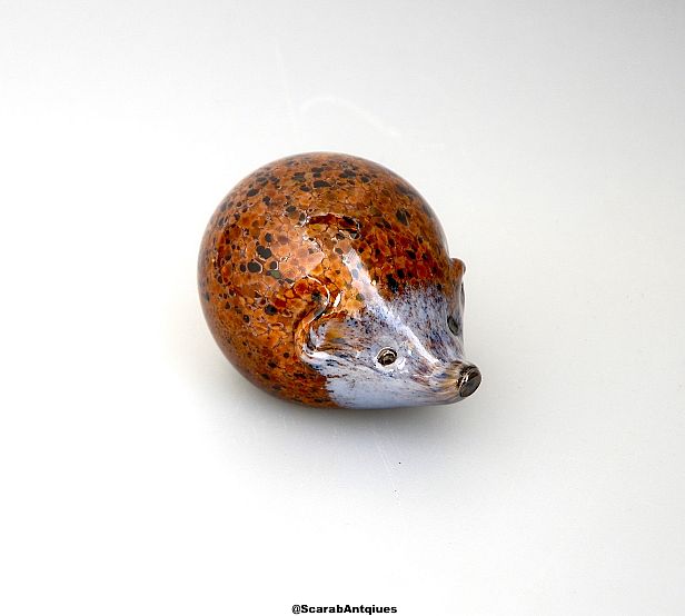 This really cute little solid glass hedgehog was made by Michale Hunter for Twists Glass in 2019. The hedgehog's body is mottled amber brown with black spots and a hint of irridescence with black button eyes and snout and an overlay of grey/white around the eyes and on the throat. The base is scratch signed "M Hunter Twists 19" and has the Twists Glass studio label.