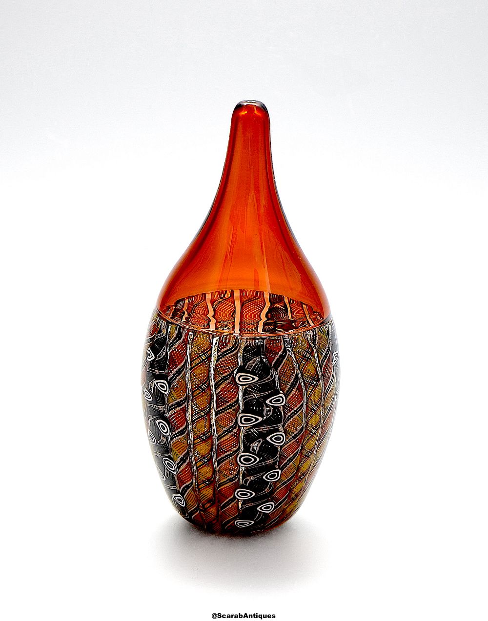 Another lovely vase made by Michael Hunter for Twists Glass in 2018. The base is Weaver pattern comprising a series of zanfirico canes in yellow red black & white, yellow red & black and black & white interspersed with black & white murrines all below an orange incalmo tapering top. The base is scratch signed "M Hunter Twists 18" and has the Twists Glass studio label.
