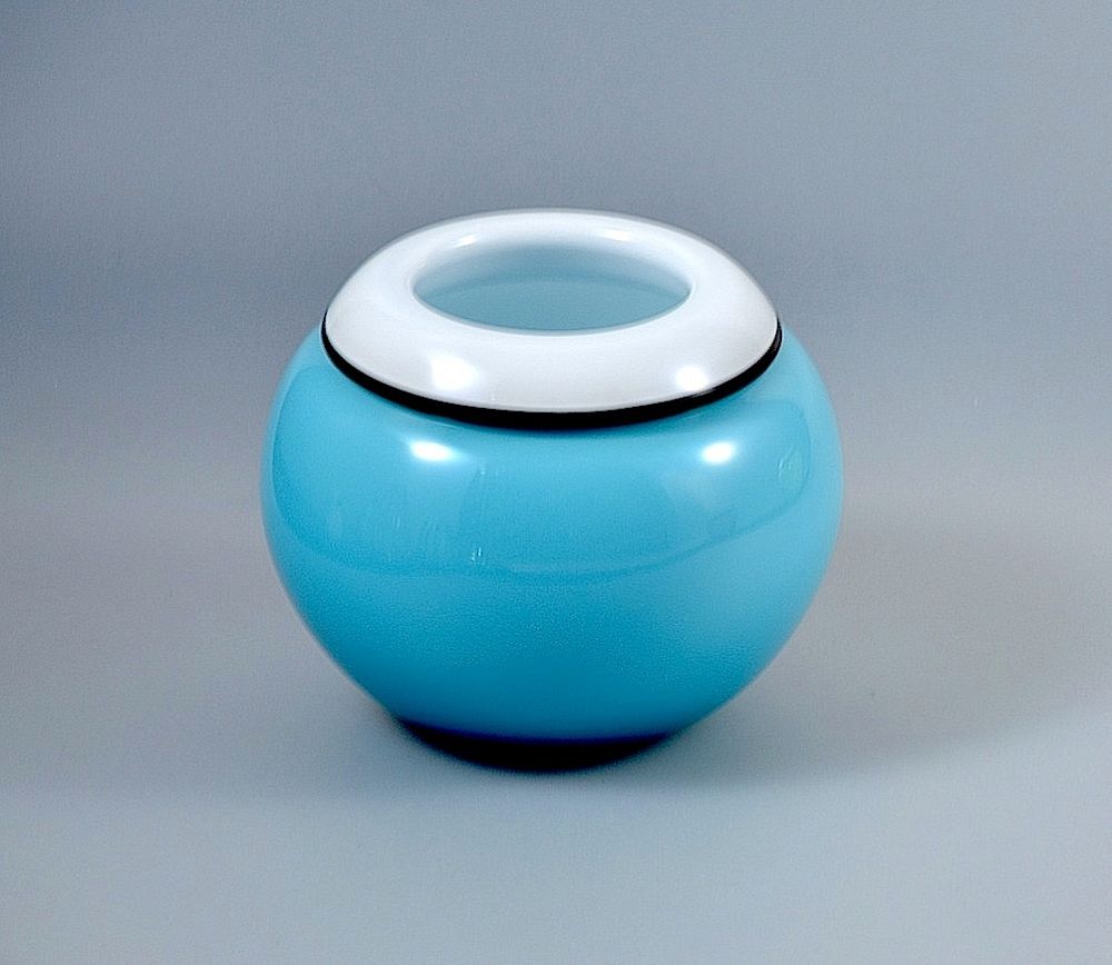 These lovely bowls known as "Serene" were made by Mike Hunter for Twists Glass in 2014. They were the first three of this new range to be produced. Each one has a pastel shade outer body with a white inner. The top of each bowl has been turned over to give a cuff effect thereby bringing the white inner layer to the outside and the cuff has a black incalmo outer edge. Scratch signed "M Hunter Twists 14"