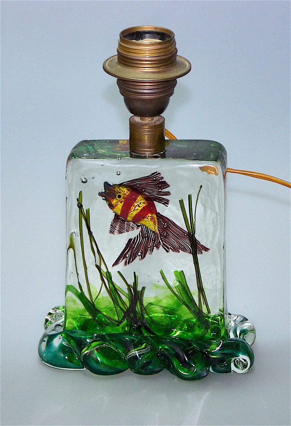 This wonderful lamp was made on the island of Murano probably in the 1950s - 60s. The lamp sits on a integral glass foot that looks like a series of rolling waves. This supports a rectangular clear glass base that is internally decorated with a bubble blowing red and yellow striped fish swimming among green seaweed and above a swirling green ocean floor.