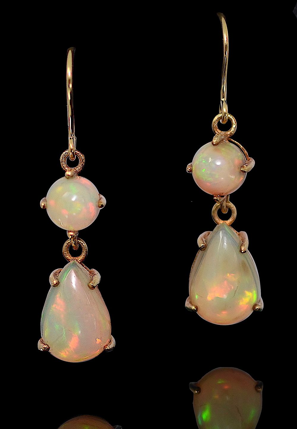 Each earring has a round cabochon cut opal set in a silver gilt smount from which is suspended an oval cabochon cut opal in a silver gilt mount.