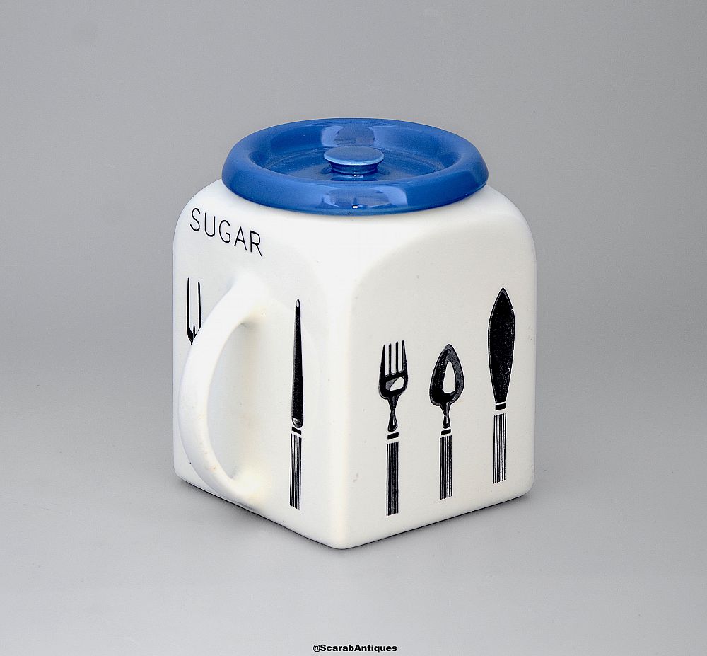 Another Pountney Pottery "Longline" storage jar with a blue lid. The square base has a handle and the word "Sugar" above and to the left of the handle. It has the usual charcoal coloured kitchen utensils decoration and the base is signed "Bristol Longline Kitchen ware by Pountney Pottery & Co Ltd The Bristol Pottery Bristol England Awarded the Official Seal of the Good Housekeeping Institute".