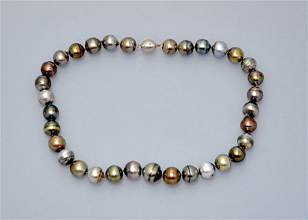 This lovely necklace consists of 33 Tahitian baroque pearls in various natural colours of black, grey, silver grey & bronze. The pearls are sightly graduated in size ranging from 13.5mm - 15mm and the string is knotted. There is a brushed 18ct white gold torpedo clasp set with 8 small round diamonds totalling approximately 0.08cts. Wear it smart or wear it casual, this necklace will always look lovely.