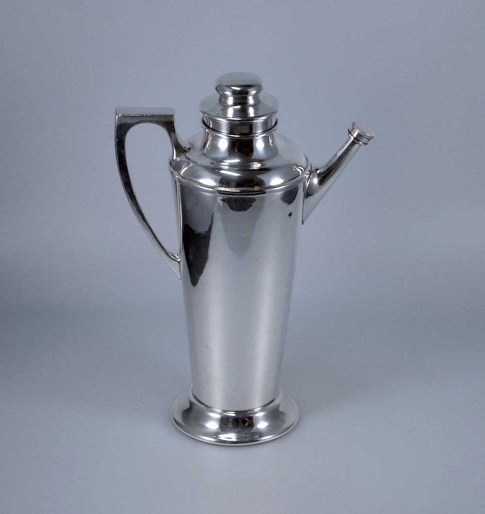 This large handsome cocktail shaker was made by the Canadian company William Rogers. Made of silver plated copper it has a round convex base leading to a flared body with spout with a screw on textured cap and handle and a removable tiered lid. Decorative & useful